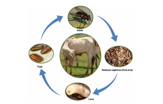 As moscas que parasitam os bovinos podem ser divididas em dois grupos, sendo uma delas as hematófagas (se alimentam de sangue) e a outra causadora de miíases (berne/bicheira), sendo assim as hematófagas só parasitam em sua fase adulta, já as moscas de bicheiras parasitam quando ainda são larvas.